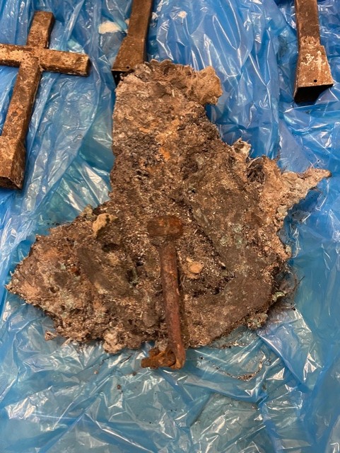 Kirkjuklukkurnar tvær úr bronsi í Miðgarðakirkju bráðnuðu í eldinum þannig að ekkert varð eftir heillegt nema kólfarnir sem eru úr járni.
