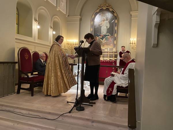 Frú Edda Möller framkvæmdastjóri Skálholtsútgáfunnar, sem gefur bókina út, afhenti Biskupi Íslands frú Agnesi M. Sigurðardóttur sálmabókina á formlegan hátt.