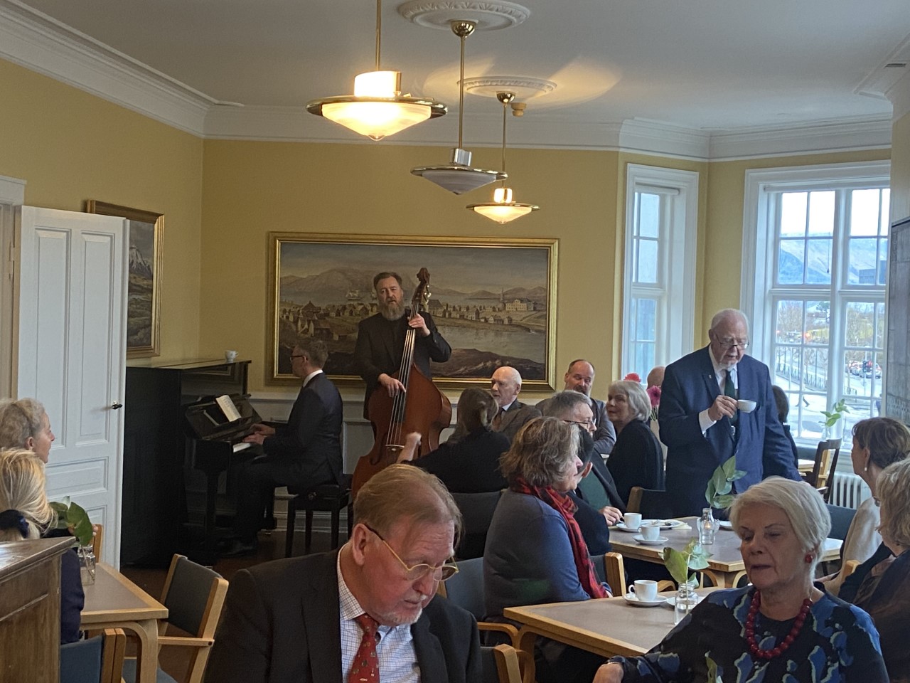 Fjölmenni var í Dómkirkjunni þennan dag og í kaffisamsæti sem haldið var eftir guðsþjónustuna í safnaðarheimilinu voru sungnir tveir sálmar við píanóundirleik organistans, Guðmundar Sigurðssonar og kontrabassaleik sóknarprestsins.