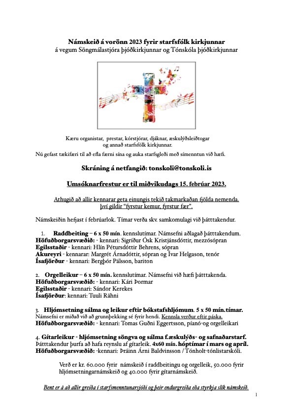 Námskeið verður á vorönn 2023 fyrir starfsfólk kirkjunnar á vegum verkefnastjóra söngmála hjá Þjóðkirkjunni og Tónskóla Þjóðkirkjunnar.