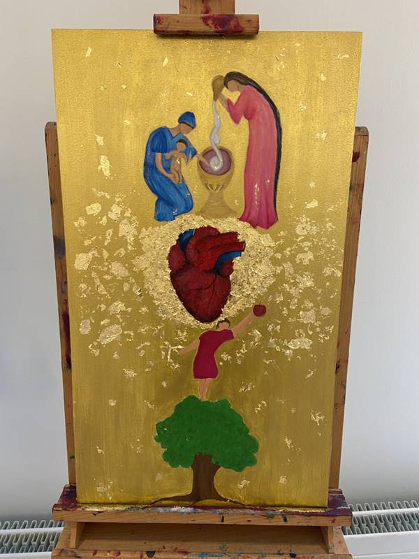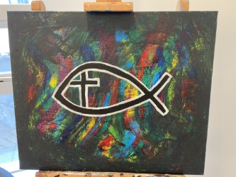 Í kjölfar umfjöllunar um táknin í kirkjunni unnu nemendur verkefni undir handleiðslu kennara sinna og sýna nú afraksturinn í safnaðarheimili Grensáskirkju.