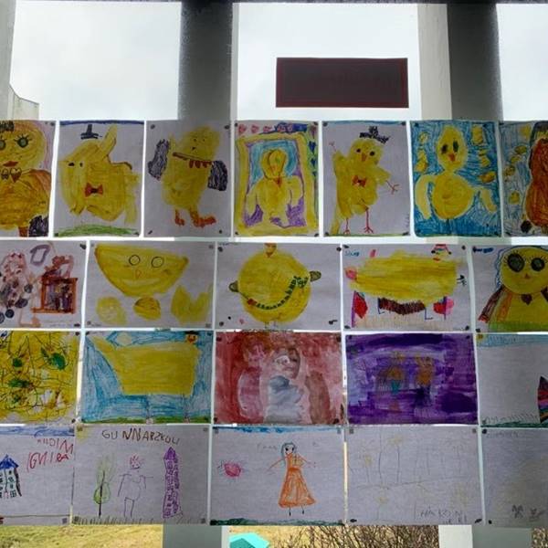 Þegar komið er inn í Bústaðakirkju blasa við listaverk barna.