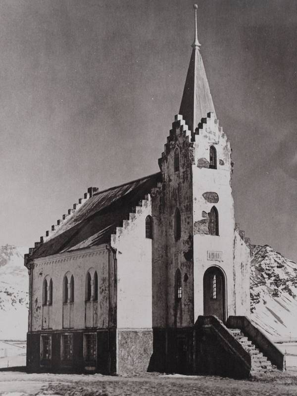 Kirkjan var byggð úr steypu og með kjallara undir.