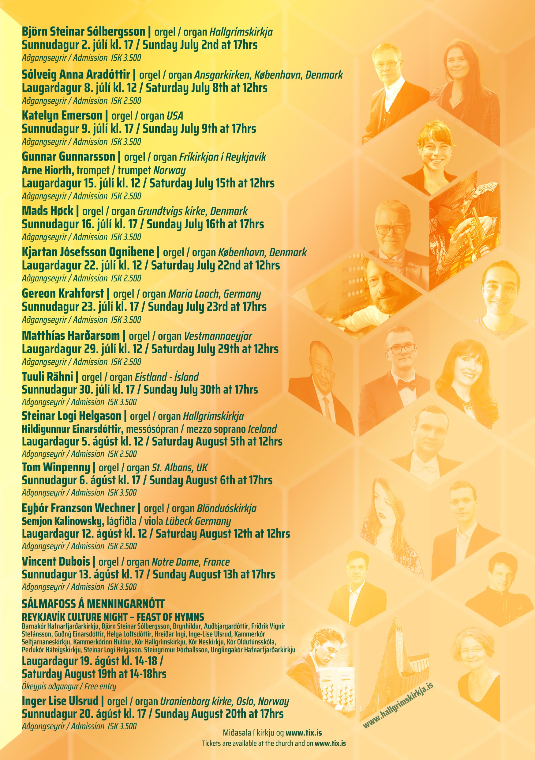 Fjórtán íslenskir og erlendir organistar leyfa Klais-orgeli Hallgrímskirkju að hljóma á laugardögum frá kl 12:00-12:30 og á sunnudögum frá kl. 17:00-18:00 í júlí og ágúst.