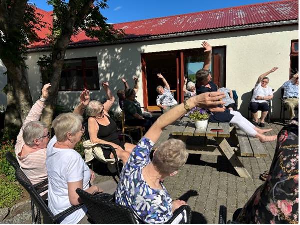 Svo er farið í morgunleikfimi og göngutúr úti.