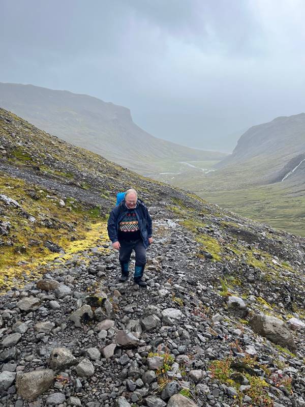 Þar tók leiðsögumaðurinn Einar Birkir Sveinbjörnsson á móti þeim og gekk með þeim yfir Skorarheiði en hann var kominn til sækja vistir, sem hraðbáturinn kom með.