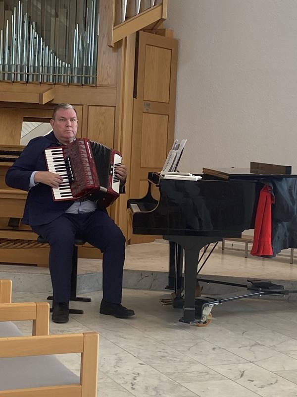 Friðrik Vignir Stefánsson organisti kirkjunnar lék forspil í valstakti á harmónikku.