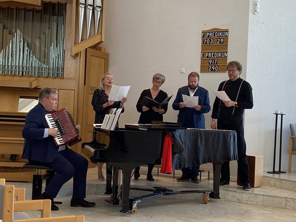 Eftir forspilið var hefðbundið messuform með sálmum úr sálmabókinni, en allir sálmarnir voru leiknir í valstakti.