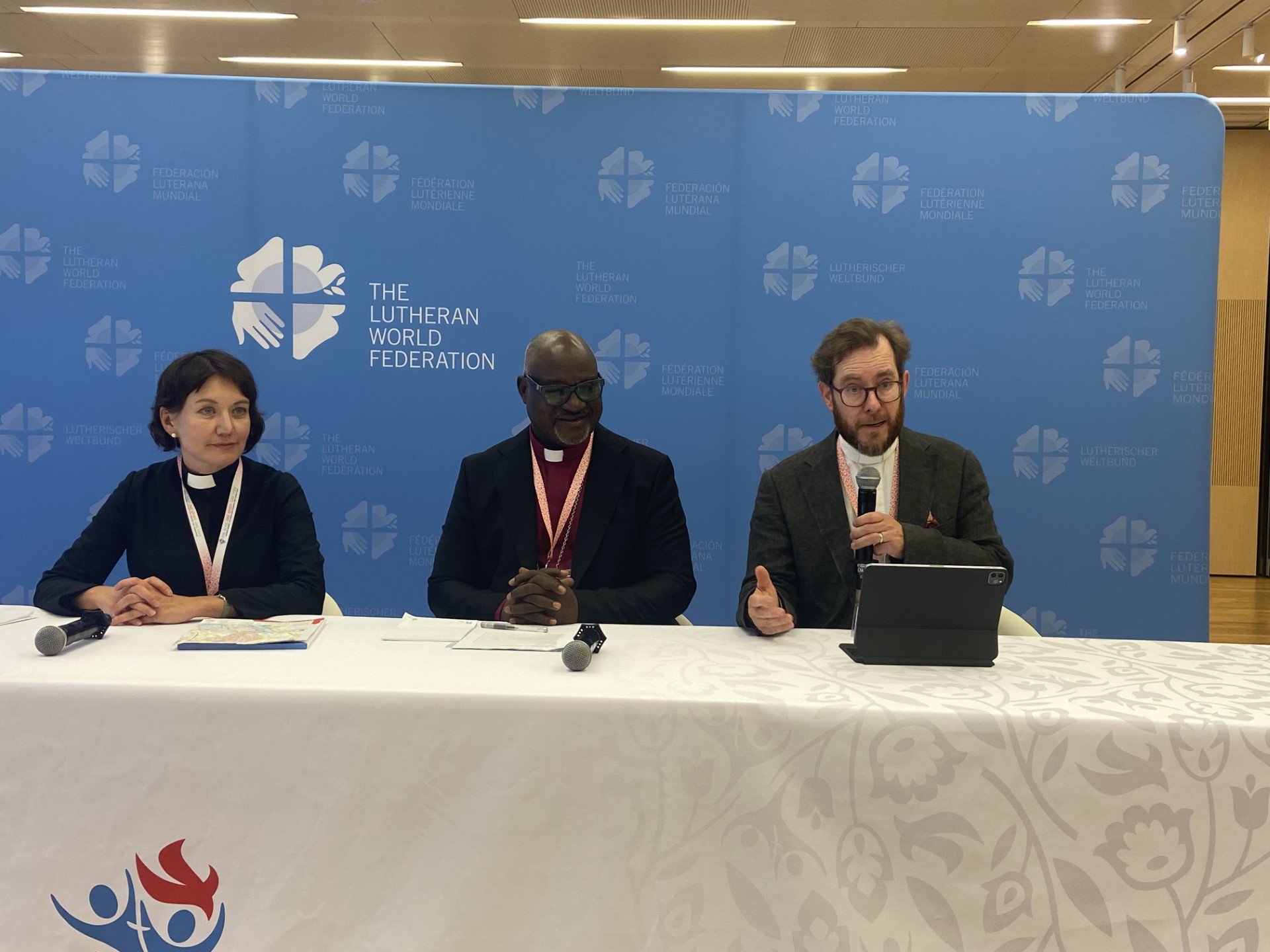 Myndir hér fyrir neðan eru af sr. Árna Svani Daníelssyni að leiða blaðamannfund með Dr. Musa forseta LWF og dr. Anne Burghardt framkvæmdastjóra LWF.
