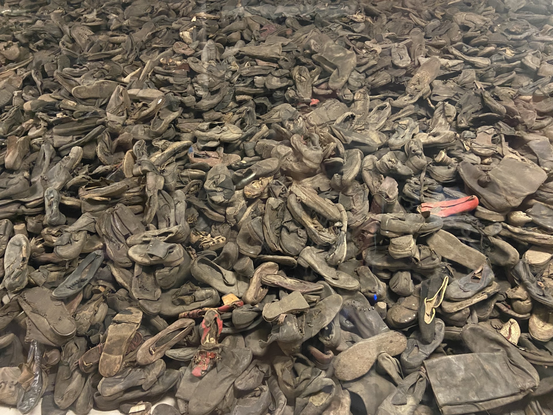 Barnaföt, haugar af skóm og andlitsmyndir af föngum.