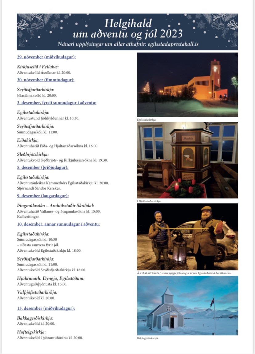 Af þessu má sjá að það verður mikið um dýrðir í Egilsstaðaprestakalli á aðventunni og þá er ekki upptaldar guðsþjónustur og sunnudagaskólar.