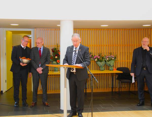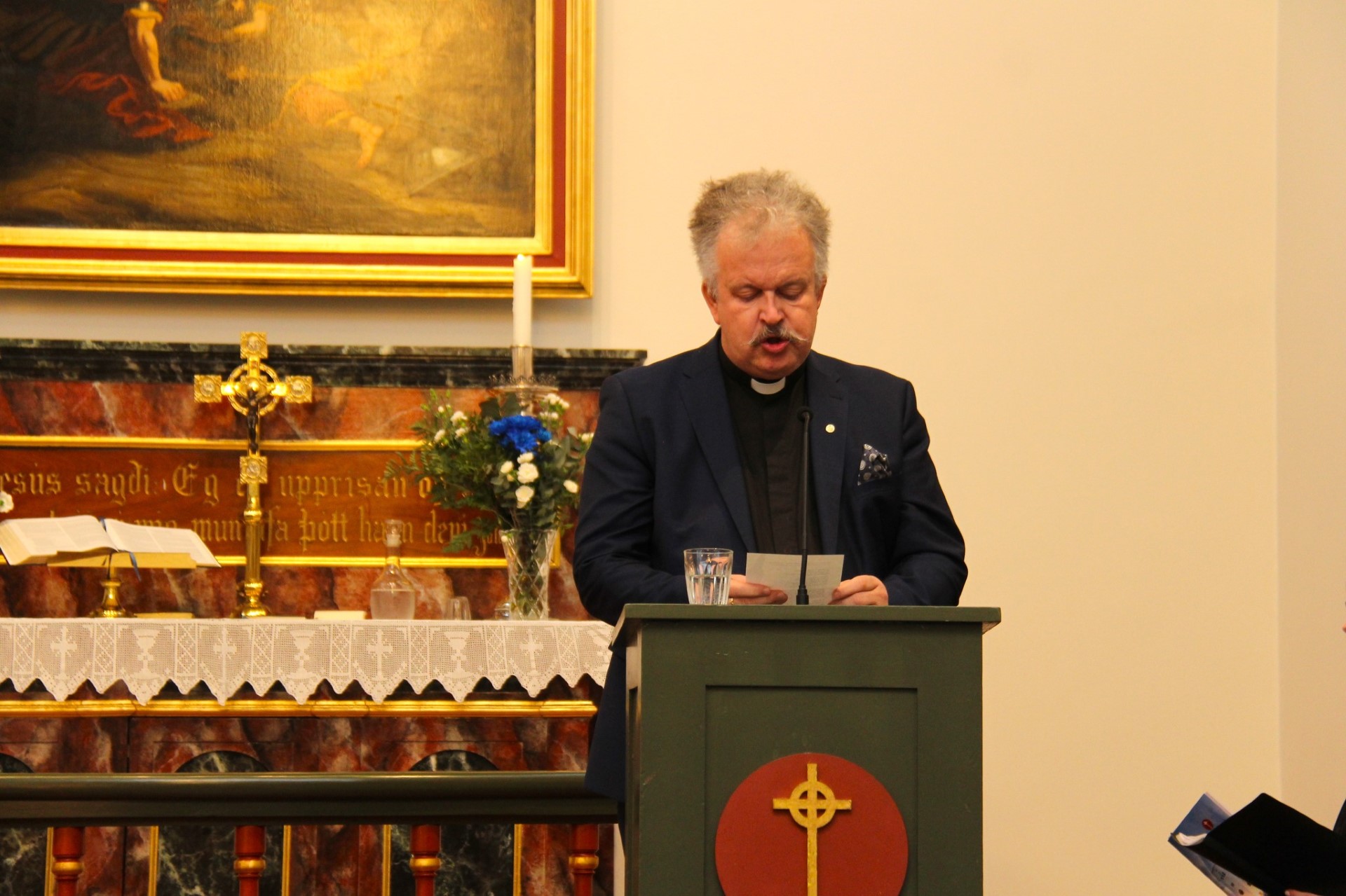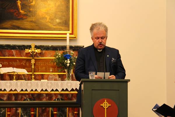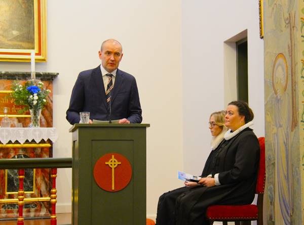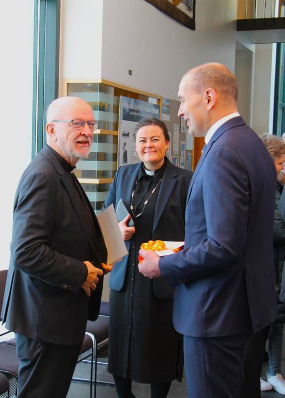 Eftir minningarguðsþjónustuna opnaði Magnús Gunnarsson formaður sóknarnefndar formlega tvíþætta sýningu í safnaðarheimili Hafnarfjarðarkirkju.