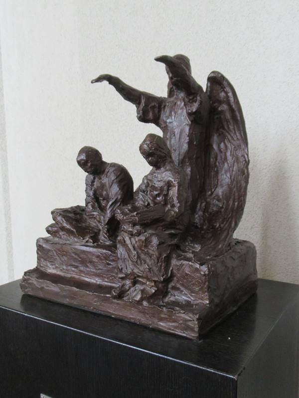 Að baki hjónunum stendur verndarengill með útbreidda vængi.“