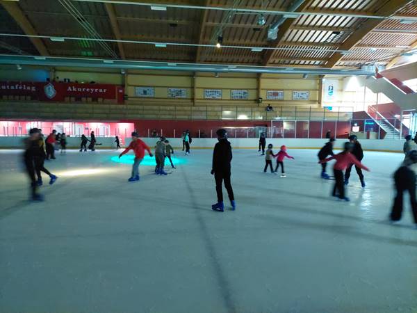 Að kvöldverði lokum var Dalvíkurrútan nýtt til að ferja alla í skautahöllina, þar sem fjörugt skautadiskó var í gangi.