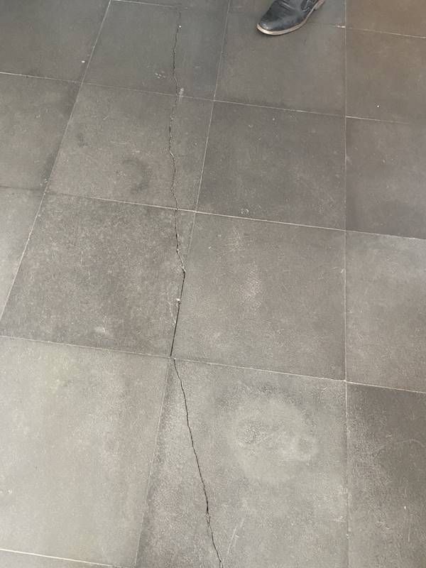 Aðeins um millimeters sprunga var fyrir framan fremsta kirkjubekkinn og jafnlítil sprunga í anddyri kirkjunnar eins og sjá má á mynd hér fyrir neðan.