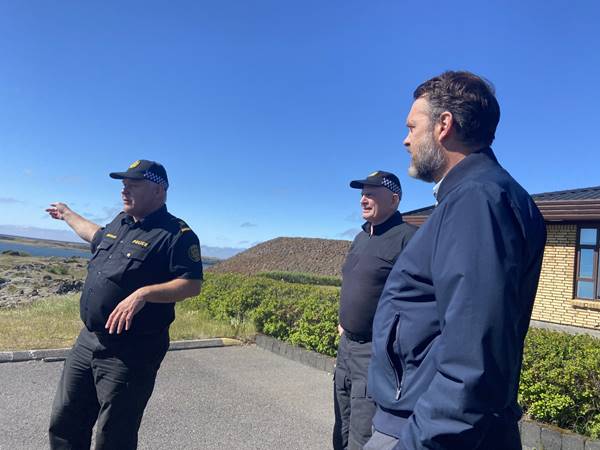 Biskup og fylgdarlið við hraunjaðarinnBiskup Íslands frú Agnes M. Sigurðardóttir fór til Grindavíkur í gær ásamt prófastinum í Kjalarnesprófastsdæmi, sr. Hans Guðberg Alfressyni.