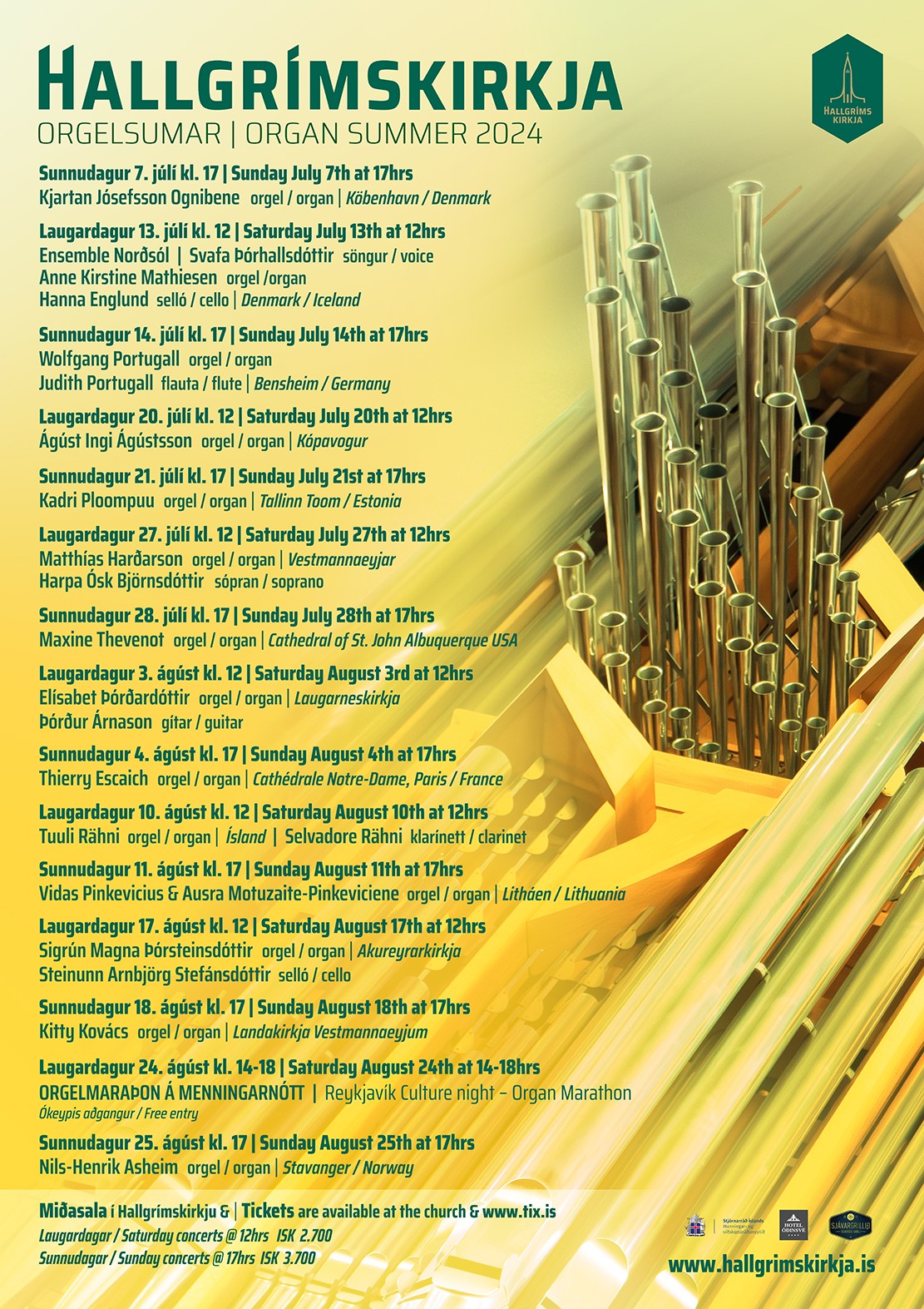 Sextán íslenskir og erlendir organistar leyfa Klais-orgeli og Frobenius-kórorgeli Hallgrímskirkju að hljóma á laugardögum kl. 12:00 og á sunnudögum kl. 17:00 í júlí og ágúst.
