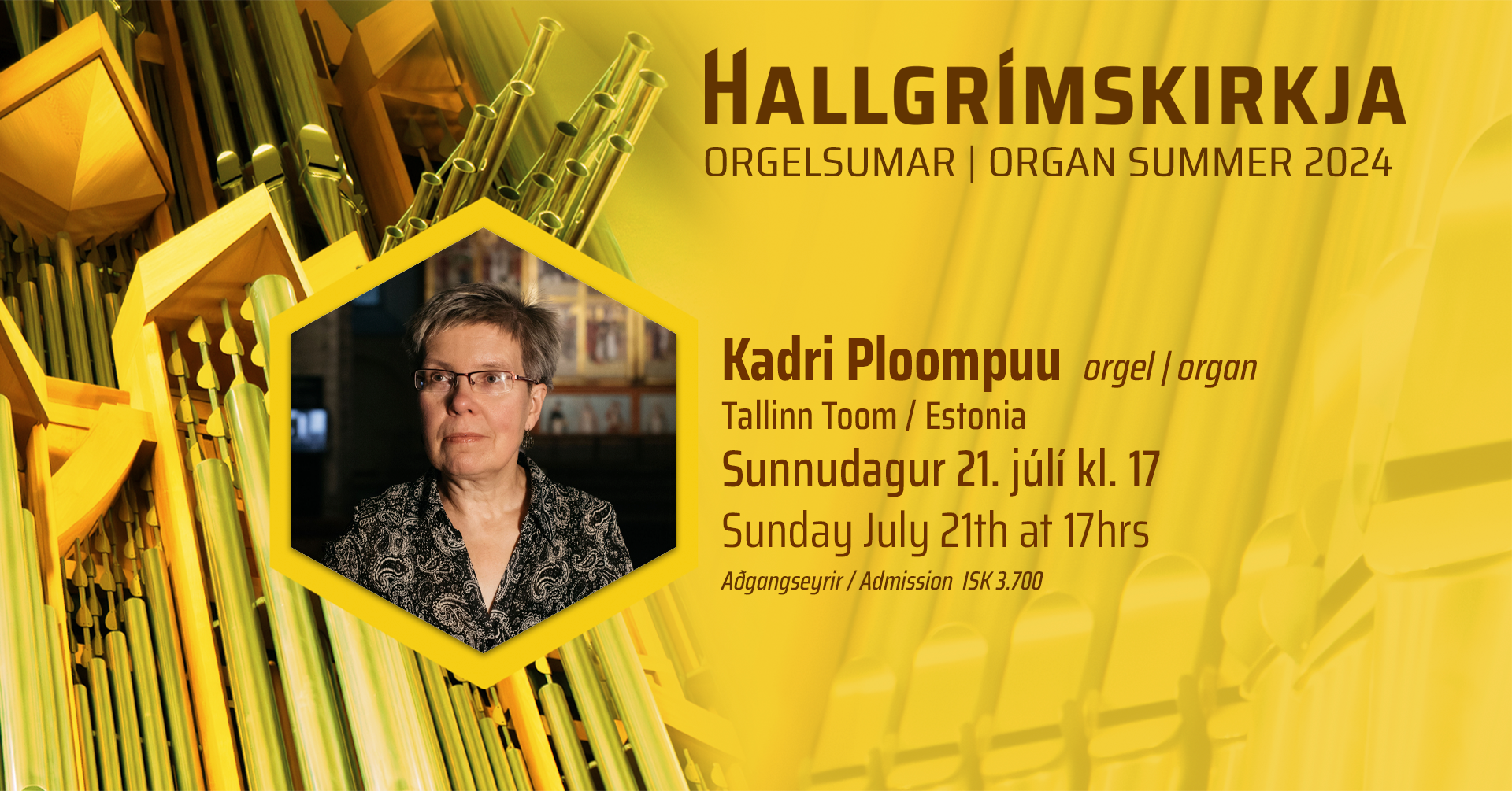 Sunnudaginn 21. júlí kl. 17:00 flytur Kadri Ploompuu organisti dómkirkjunnar í Tallinn í Eistlandi verk eftir Mykola Kolessa, Tõnu Kõrvits, Johann Sebastian Bach, Erkki-Sven Tüür, Olivier Messiaen og Philip Glass.
