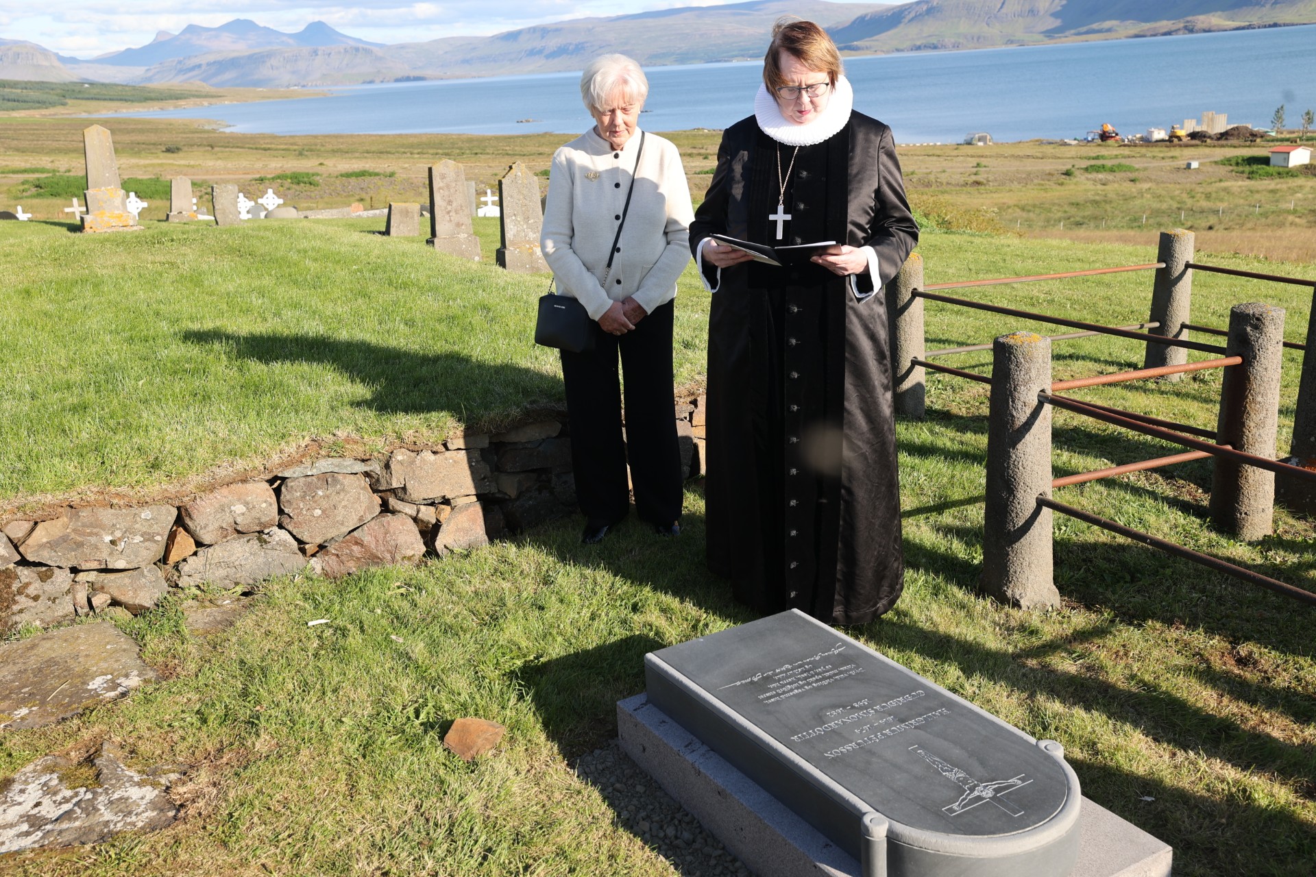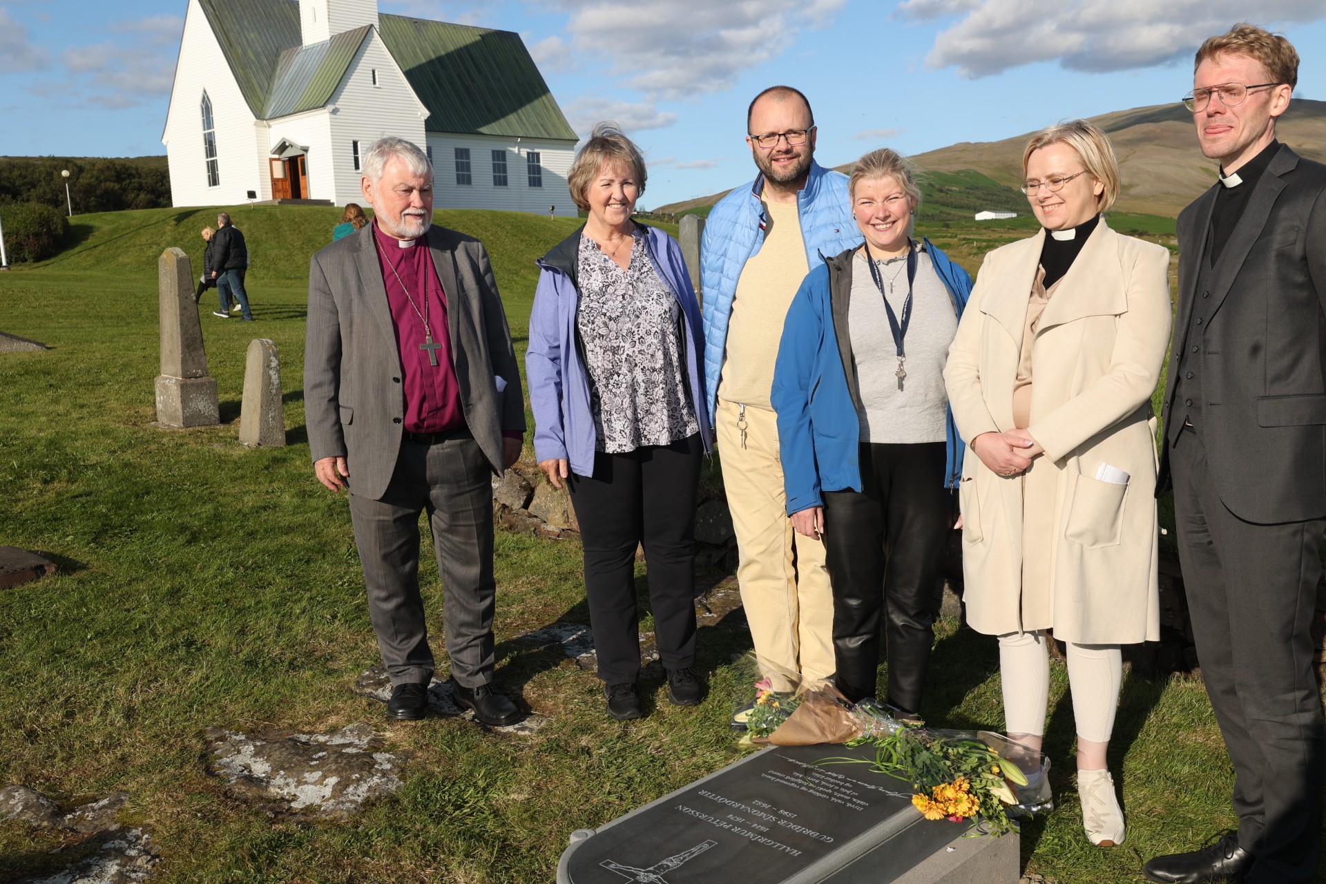 Eftir athöfnina í kirkjunni var gengið að leiði Hallgríms þar sem biskup Íslands frú Agnes M. Sigurðardóttir og frú Kristín Þ. Guðjónsdóttir ekkja sr. Karls Sigurbjörnssonar biskups, afhjúpuðu minningarstein Hallgríms og Guðríðar.