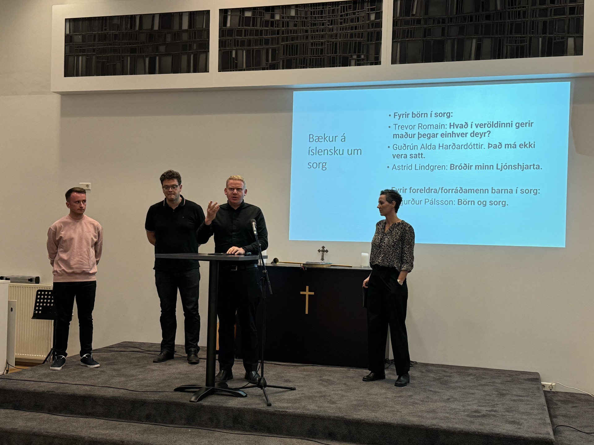 Í safnaðarheimilinu ræddu sr. Guðni Már Harðarson, sr. Dís Gylfadóttir og sr. Ólafur Jóhann Borgþórsson um hvernig bregðast skuli við áföllum í barna og æskulýðsstarfi.