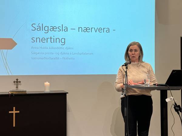 Í safnaðarheimilinu ræddi Anna Hulda Júlíusdóttir djákni um sálgæslu, nærveru og snertingu og hvernig þessir þrír þættir fléttast saman í samfylgd á erfiðum stundum.