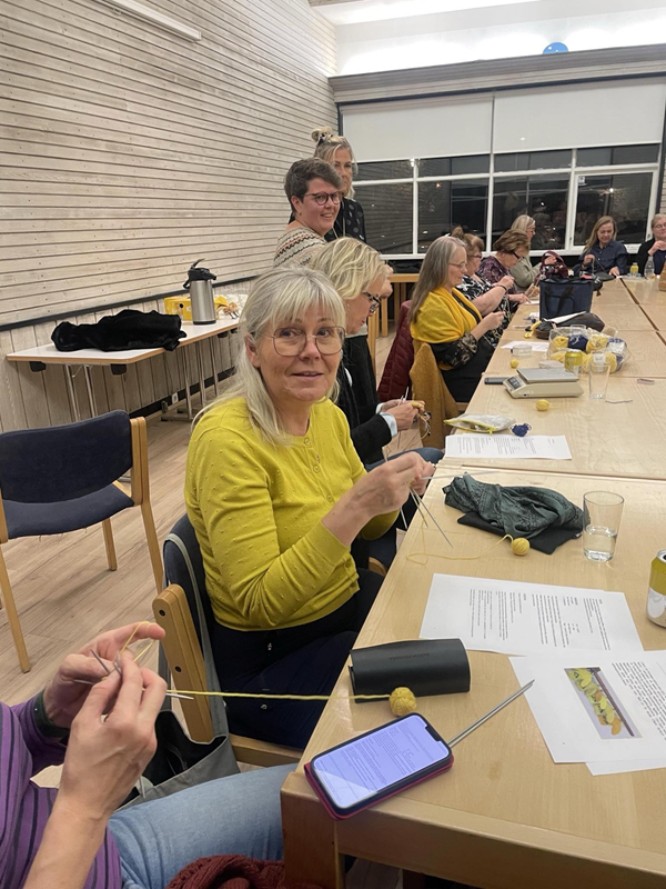 Síðast liðið mánudagskvöldið hittist svo góður hópur kvenna og prjónaði saman Litlu gulu peysuna sem Edda Lilja Guðmundsdóttir hannaði.