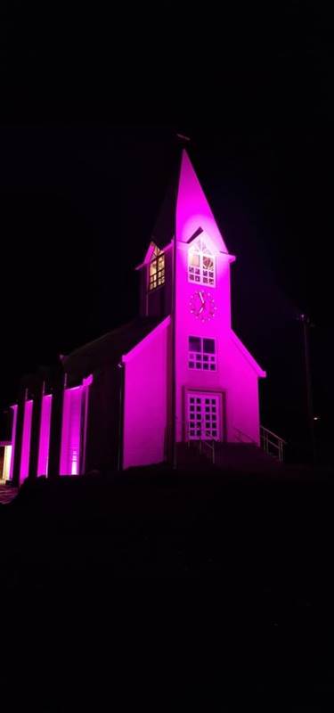Myndirnar hér fyrir neðan tók Arnar Aðalbjörnsson, en þar má sjá að bleikur október var í heiðri hafður, kirkjan upplýst í bleikum lit og brauðtertan er skreytt með bleiku slaufunni.