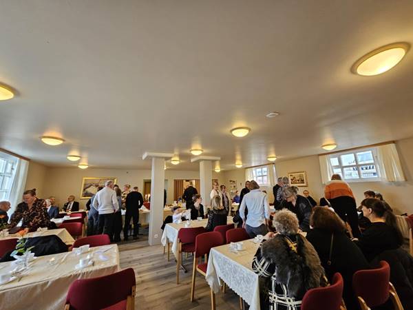 Eftir messuna var kirkjugestum boðið í kaffi í umsjón Kvenfélagsins Hvatar í glæsilegu nýuppgerðu safnaðarheimili þar sem fulltrúar Ísfélagsins, þeir Siggeir Stefánsson og Rafn Jónsson afhentu formlega útilýsingu og héldu ræðu um hana og byggingarsögu kirkjunnar.