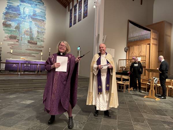 Vígslubiskup og sóknarpestur ásamt sóknarbarniÞað var 10 stiga frost og dásamlega fallegt vetrarveður þegar hringt var til messu í Skálholtsdómkirkju í gær á fjórða sunnudegi í aðventu.